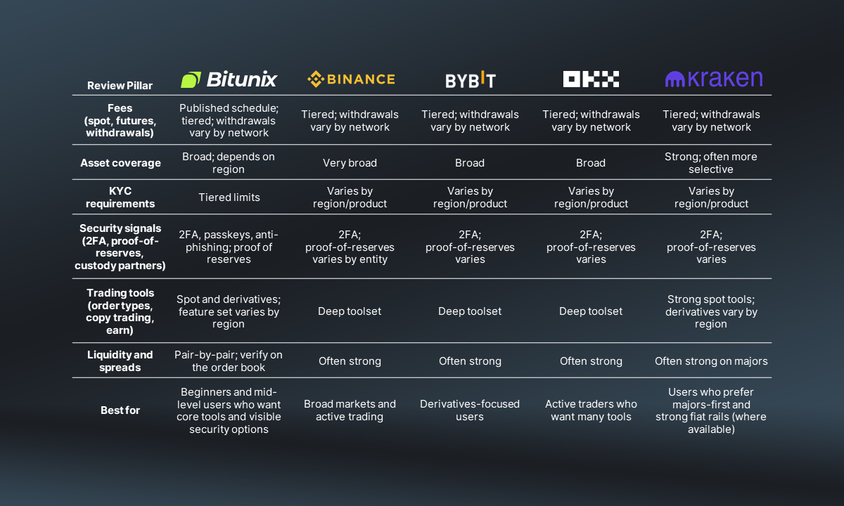 The grid below lines up Bitunix against a few widely used exchanges and focuses on the checks that usually matter most to traders (fees, KYC, security signals, and tools):